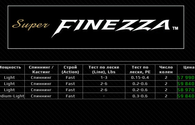 - Кольца fuji torzite в титановой оправе, обмотка колец разделенная. Катушкодержатель FUJI со вставкой высококачественной EVA.Kарбон, из которого изготовлены спиннинги - T1100G, данный материал изготавливается по патентированной технологии Nanoalloy, и на сегодняшний день является самым плотным карбоном в мире.