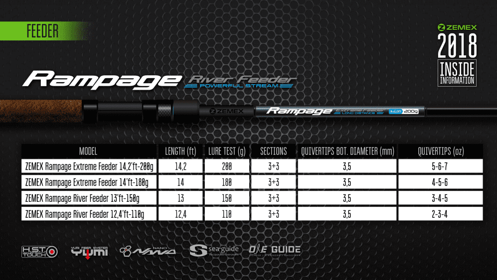 Земекс рампейдж - удилища имеют хорошие вяжущие свойства для того чтобы противостоять трофейным сазанам, язям, голавлям и лещам. Одним словом основная концепция RAMPAGE River Feeder это тонкий баланс между мощным речным инструментом быстрого строя, и легкой спортивной чувствительной удочкой высокого класса.