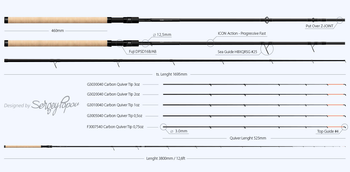 - ZEMEX Icon Tournament Feeder 12.6ft – 90g. Спортивное удилище класса medium длиной 3.80m. Его вес составляет 207g. Это двухчастная модель с комплектом квивертипов: 0.5, 0.75, 1, 2, 3oz с посадочным диаметром 3mm. В сет направляющих фидера входит 9 колец, первое из которых #25. Транспортировочная длина 170cm. Рекомендованные дистанции ловли 30 - 50m при использовании оснасток весом 25 - 60g с кормушками среднего размера. Это удилище высшего класса, которое отлично подходит для ловли самой разнообразной рыбы на реках с умеренным течением, а также на прудах и водохранилищах. Сверхбыстрый строй бланка, позволяет не только с легкостью совершать точные забросы в ветреную погоду, но и отлично подойдет для создания различного рода анимации приманки, которая, зачастую, необходима в ходе соревновательного процесса. Разнообразие квивертипов позволяет использовать снасть в самых различных условиях ловли. ZEMEX Icon Tournament Feeder 12.6ft – 90g это спортивное удилище высочайшего класса с очень обширной областью применения.
