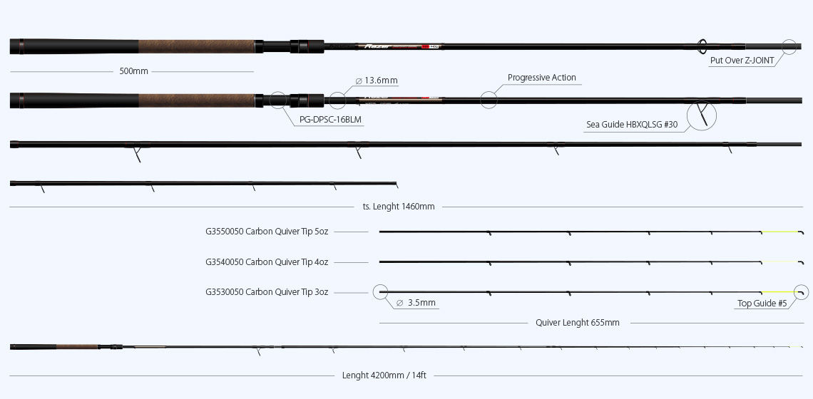 - ZEMEX Razer Progressive Feeder 12ft – 80g Удилище medium класса в длине 3.60m с тестом до 80g. Общий вес составляет 225g. Состоит из трех частей и трех карбоновых квивертипов: 1, 2 и 3oz с посадочным диаметром 3mm. В сет направляющих фидера входит 9 колец, первое из которых #20. Транспортировочная длина 127cm. Рекомендованные дистанции ловли 25 - 40m при использовании оснасток весом 30 - 60g, FLAT - Method 45 - 60g. Фидер medium класса, пожалуй, один из самых универсальных в этой серии. Может с успехом применяться как при ловле карпа и амура на FLAT - Method, так и при ловле леща при использовании классических фидерных оснасток. Хороший баланс и прогрессивный строй бланка, позволяют с легкость справляться с сильной рыбой и при необходимости использовать форсированное вываживание. Оптимально подходит для ловли на умеренном течении, а также при ловле за крутыми бровками. ZEMEX Razer Progressive Feeder 12ft – 80g – это универсальное удилище medium класса для ловли средней и крупной рыбы в самых разных условиях.